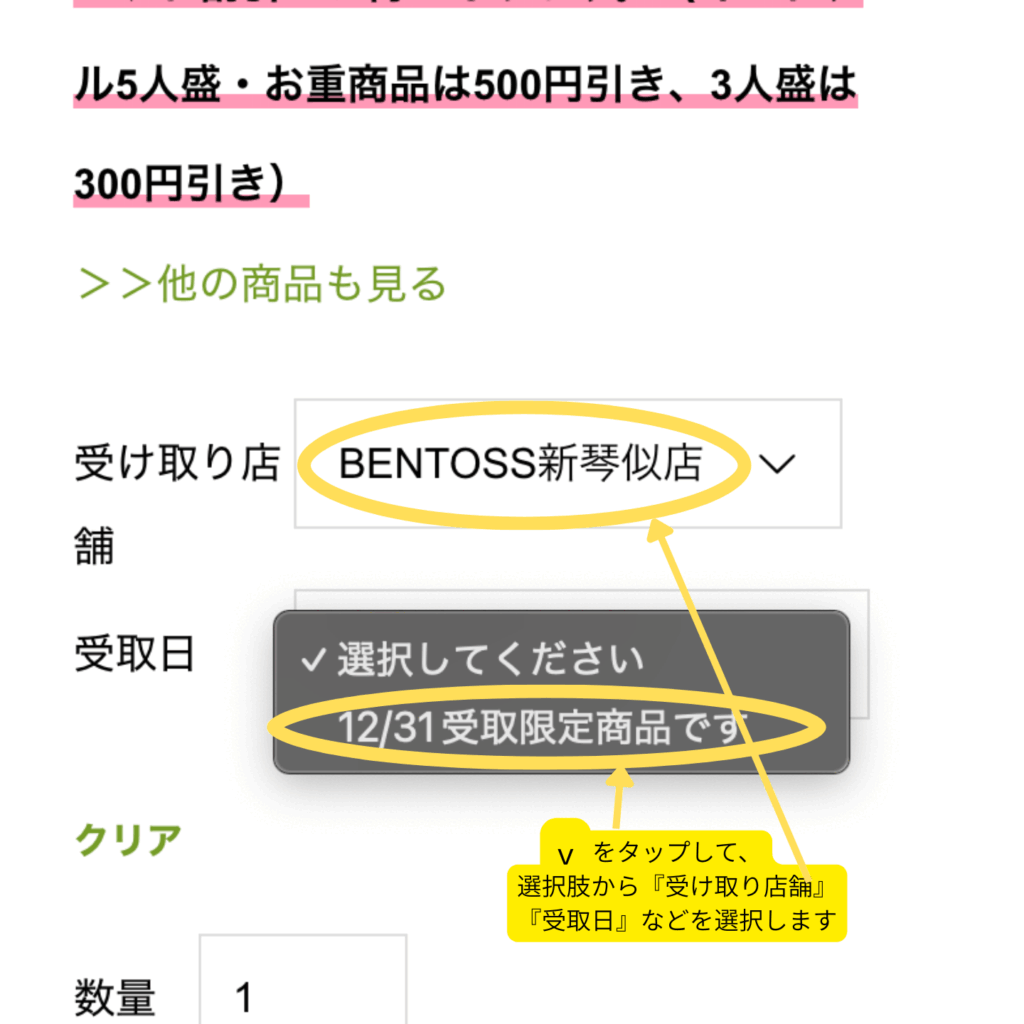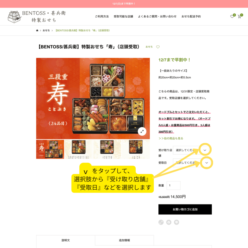 1. 商品詳細ページで「受け取り店舗」「受取日」を選択します。