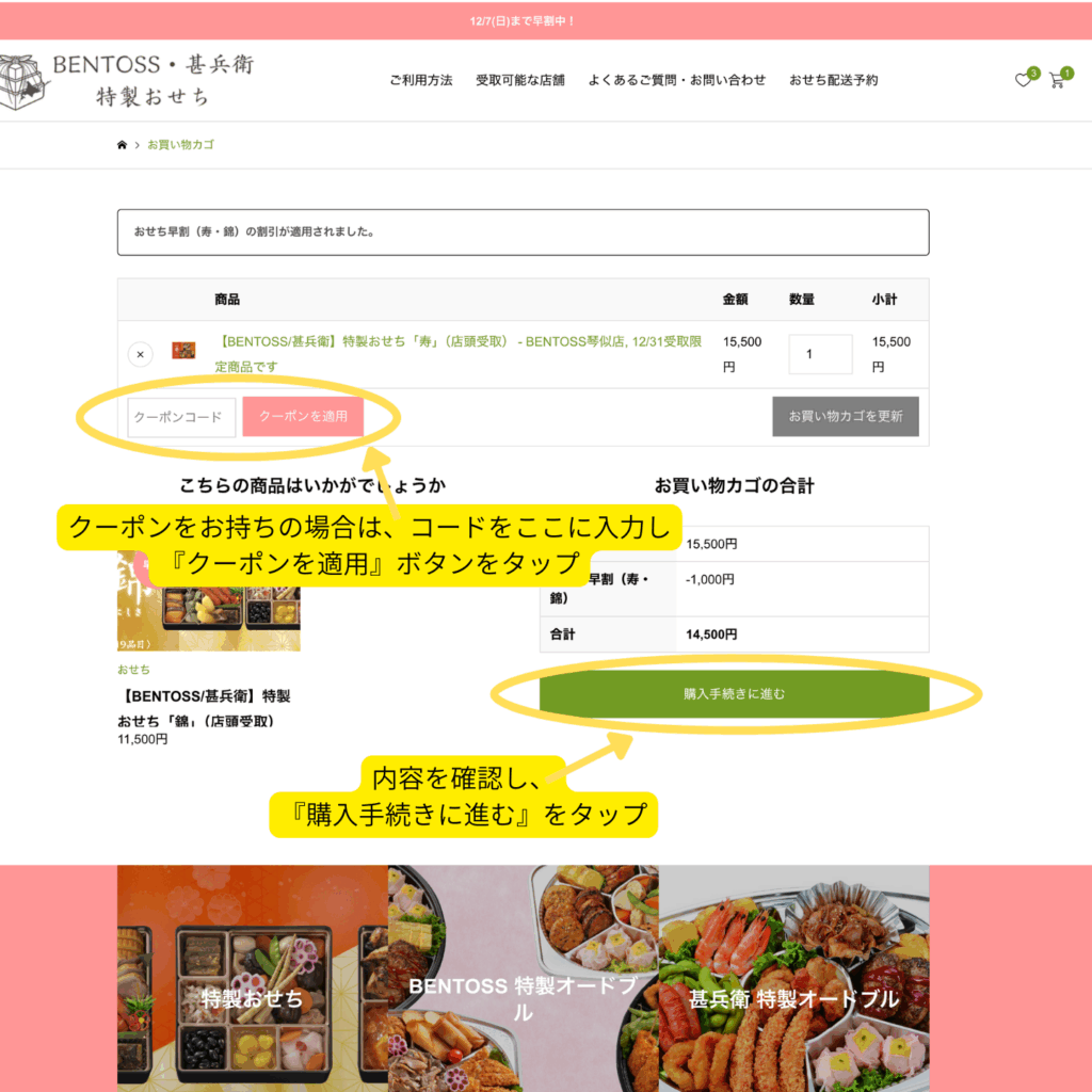 2. お買い物かごでクーポン適用、購入手続きに進む
