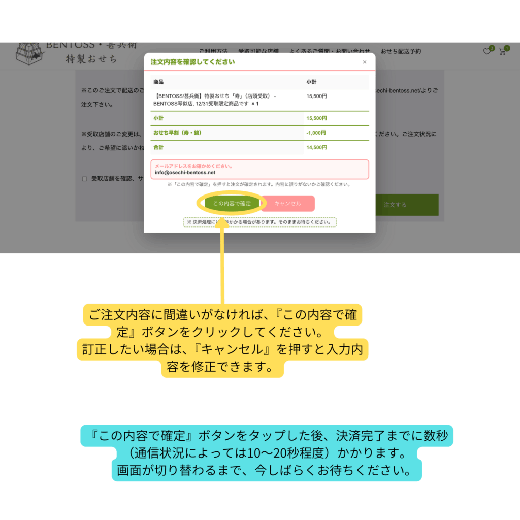 4. 「注文を確定する」をクリック後は、決済が完了するまで数秒お待ちください。画面を閉じたり、戻るボタンを押さないでください。