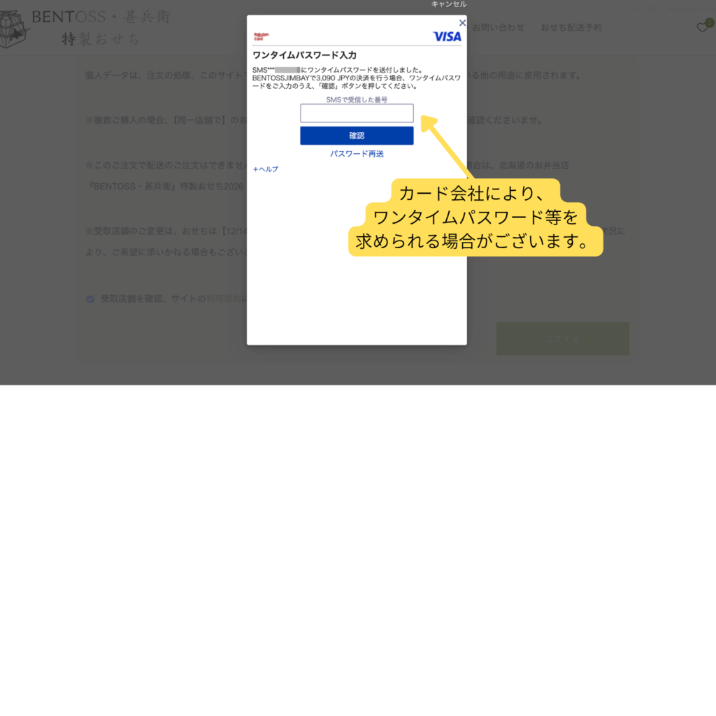 5. ご利用のカード決済会社により、ワンタイムパスワードの入力等の確認画面が表示される場合がございます。