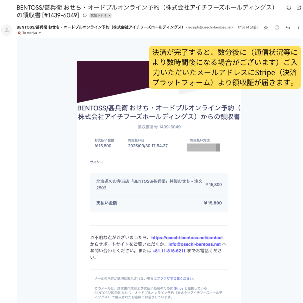 1. 入力したメールアドレス宛に「ご注文確認メール」とStripe(決済プラットフォーム)からの領収証がメールで届きます。