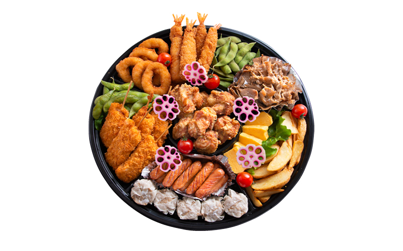 献立名函館塩からあげ・生姜焼き・串カツ・エビフライ・イカリング・函館塩しゅうまい・ウィンナー・フライドポテト・玉子焼き・塩ゆで枝豆