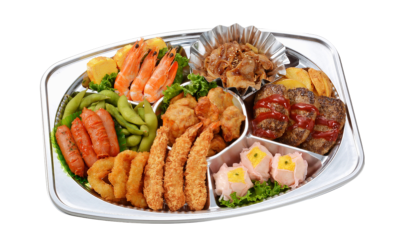 献立名エビフライ・ハンバーグ・チキン唐揚げ・エビの姿煮・生姜焼き・花しゅうまい・イカリングフライ・粗びきウィンナー・フライドポテト・塩ゆで枝豆・玉子焼き